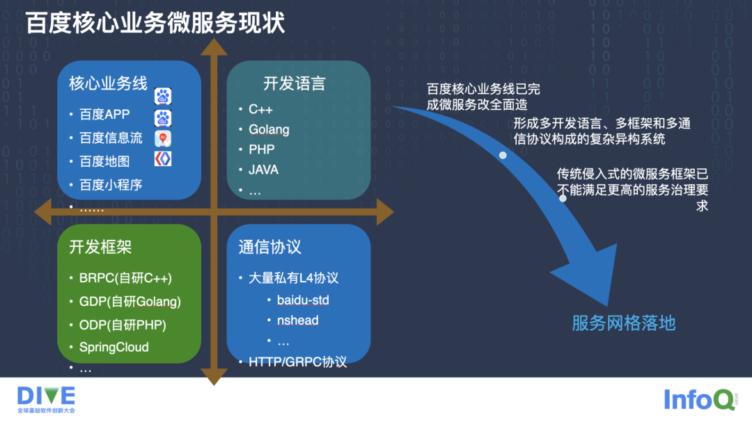 在通讯协议方面,因为百度很多核心商业对性能有很高的要求,我们在大量的私有协议里有很多扩展,其中有大量的 L4 层协议。通过这样一个方式,百度的很多业务线已经完成了微服务的改造,它可能还是停留在传统的服务框架和 SDK 这样一个模式,形成了一个多开发语言、多框架和多通讯协议的复杂的异构系统。