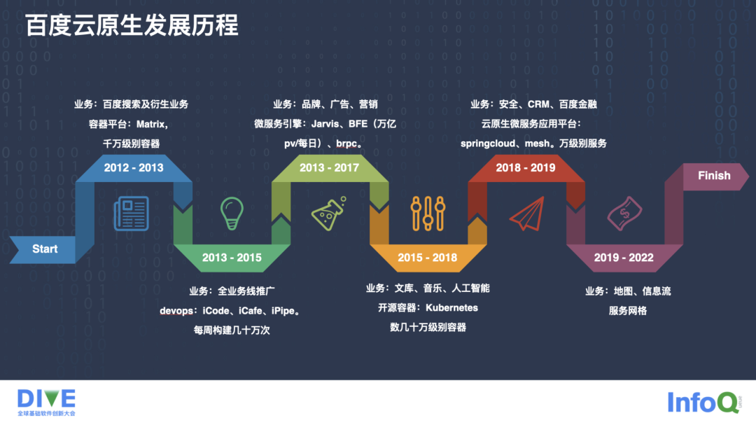 百度在云原生领域的发展历程还是比较早的,我们在 2012 年到 2013 年,内部就有很多这种容器平台,比如 Matrix。在 2013 到 2015 年,我们内部有很多业务线逐步地去落地和推广云原生理念。在 2013 年到 2017 年,我们有大量的品牌业务、广告业务、营销业务开始使用了微服务引擎,其中比较典型的是我们的 BFE,以及百度 RPC(brpc)。