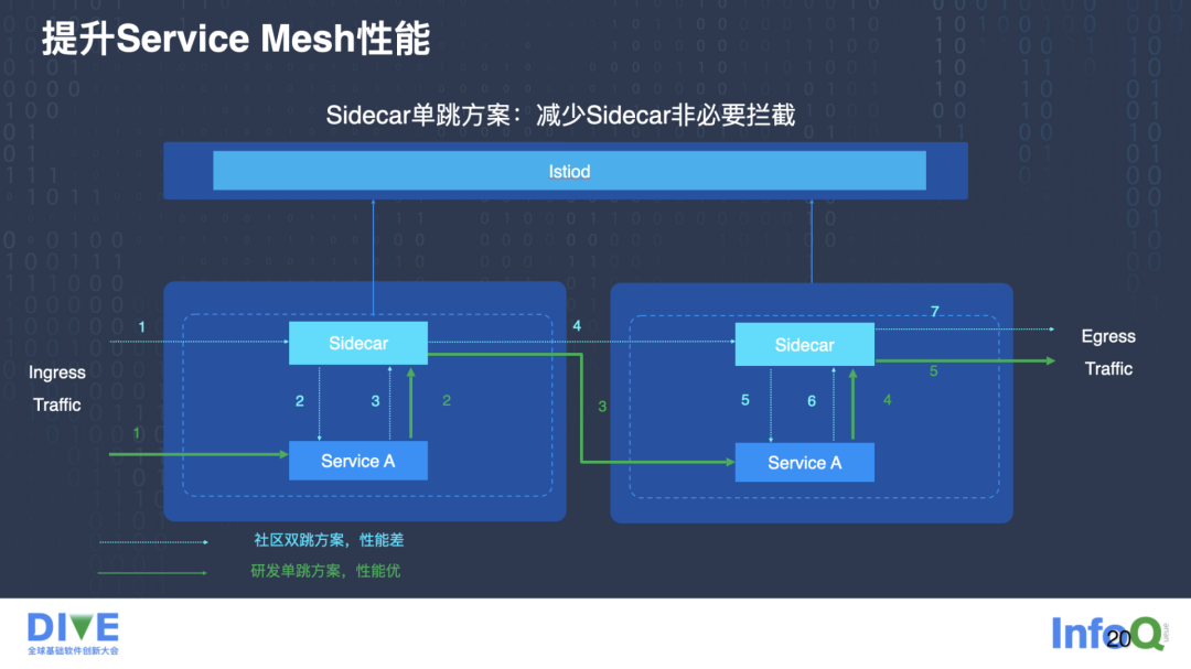 先来看一下社区的方案。社区的方案是一个典型的双跳方案,每个业务程序都有一个边车,所有的流量都要经过两次边车处理,它有一个两倍的延时,包括两倍的资源开销。