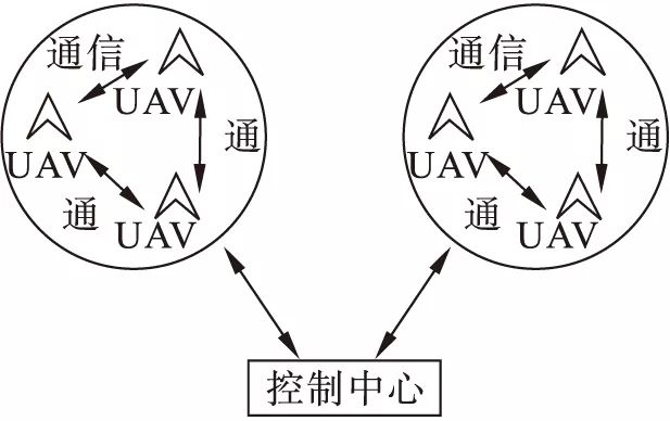 分层次分布式控制系统(见图1)同时具有集中式和分布式控制系统结构双方的优点,是一种混合的控制系统结构。将所有的无人机根据一定的规则进行分层和归类,先根据类别分组,同一层次的无人机类和同一组内的无人机选择集中式控制系统结构,不同的组和控制中心则选择分布式控制系统结构。这种控制系统结构在无人机执行作战任务时,具有很大的灵活性,可以自主根据真实状况调节与控制中心之间信息的交流量,一定程度上减少了计算时间,同时还可以根据实际战场情况适时地调整任务分配策略,更加满足实际战场的要求。