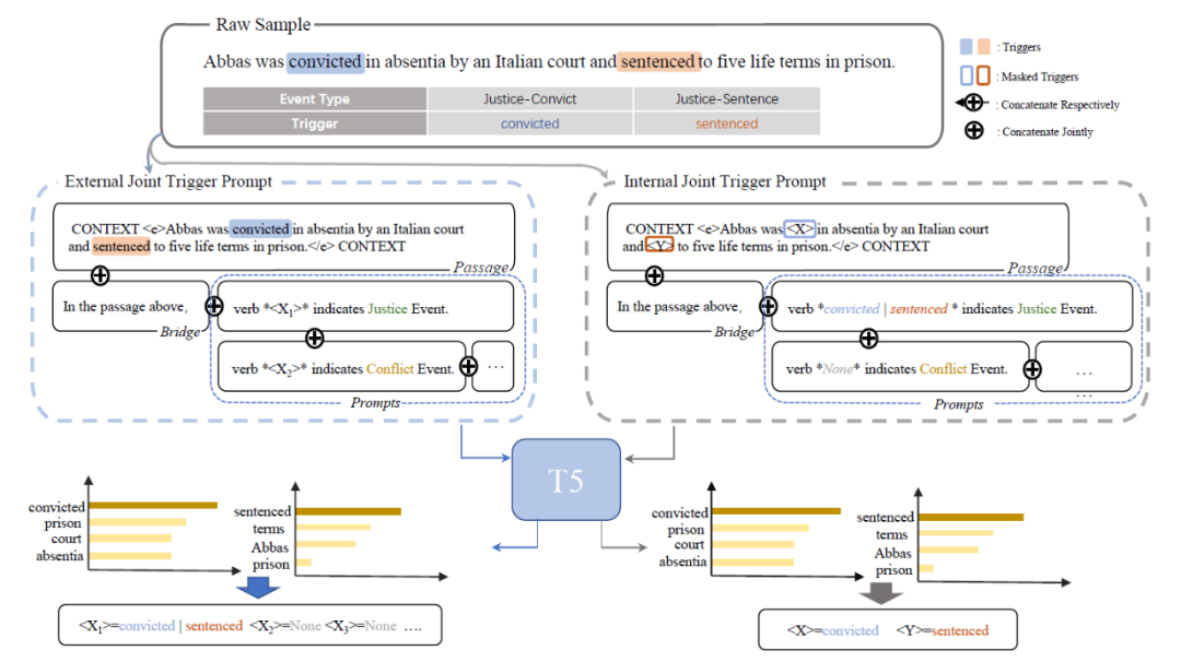 PoKE 模型用于事件检测任务的模型结构如下图所示,Prompt 分为两部分一部分是 external 的,一部分是 internal 的,这个主要是看 mask 的地方是在 passage 内部还是在添加的 prompt 上。具体来说针对 External 的 Prompt,在 passage 后面拼接上桥接词 'In the passgae above',还有针对每个事件类型的 Prompt (格式为:verb <X> indictates xxx Event)然后送进 T5 中预测 mask 处的词。为了帮助模型更好地理解,作者还使用了 internal 的 Prompt,内容上跟前者一样,只是在前者 mask 的地方填上正确的 trigger 词,反而将上下文中的 trigger 词 mask 掉,然后送入 T5 预测。