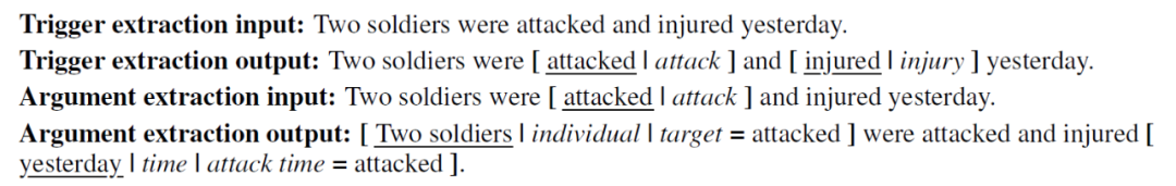 任务形式如下图所示:针对 REE 任务,使用预先定义的模板,<SOT> 和 <EOT> 表示模板的开始和结束,<SOSN> 和 <EOSN> 表示 slot name 的开始和结束,<SOE> 和 <EOE> 表示实体的开始和结束;针对关系抽取任务,同样使用以上类似的模板。