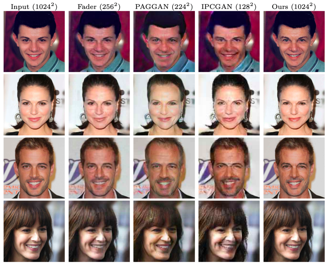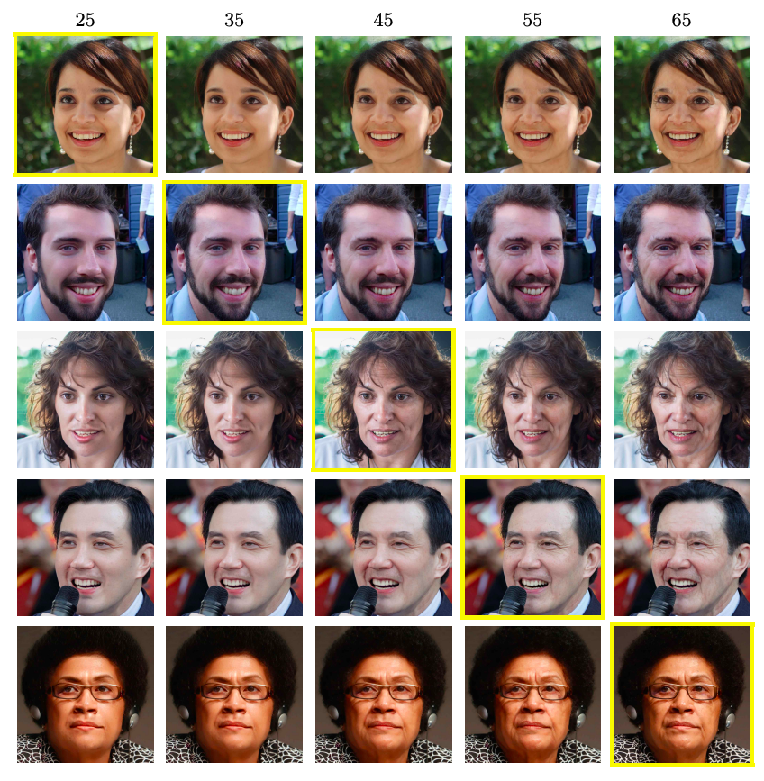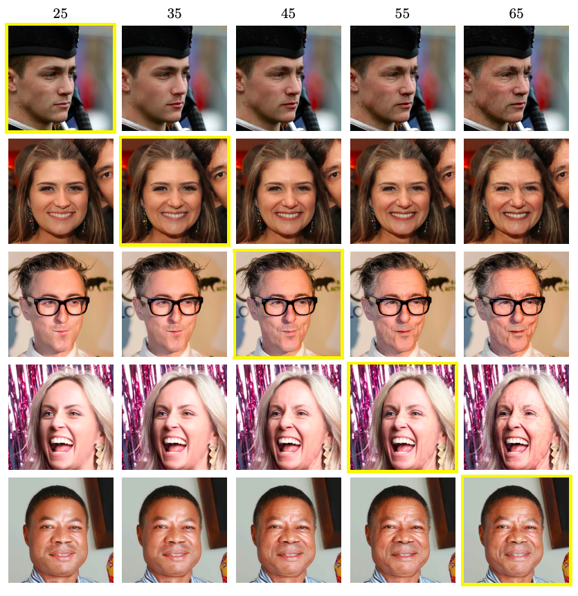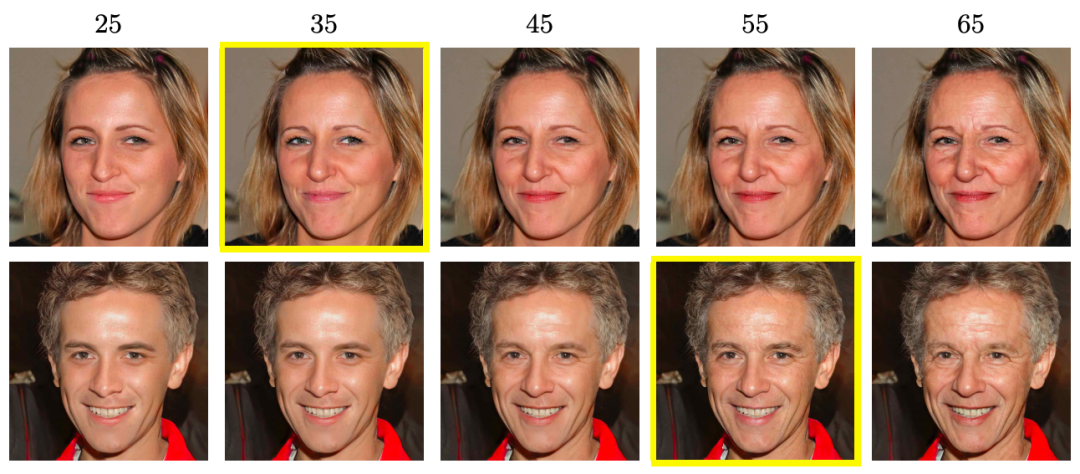 上面的图像,黄色框起来的是该行输入图像,用一幅图像生成25到65各年龄的图像。是不是效果很惊艳了!?关键是这些生成的图像分辨率1024x1024(因微信系统所限,上述图像并未达到如此高分辨率),让人看到的细节都很真实,并没有明显的瑕疵!