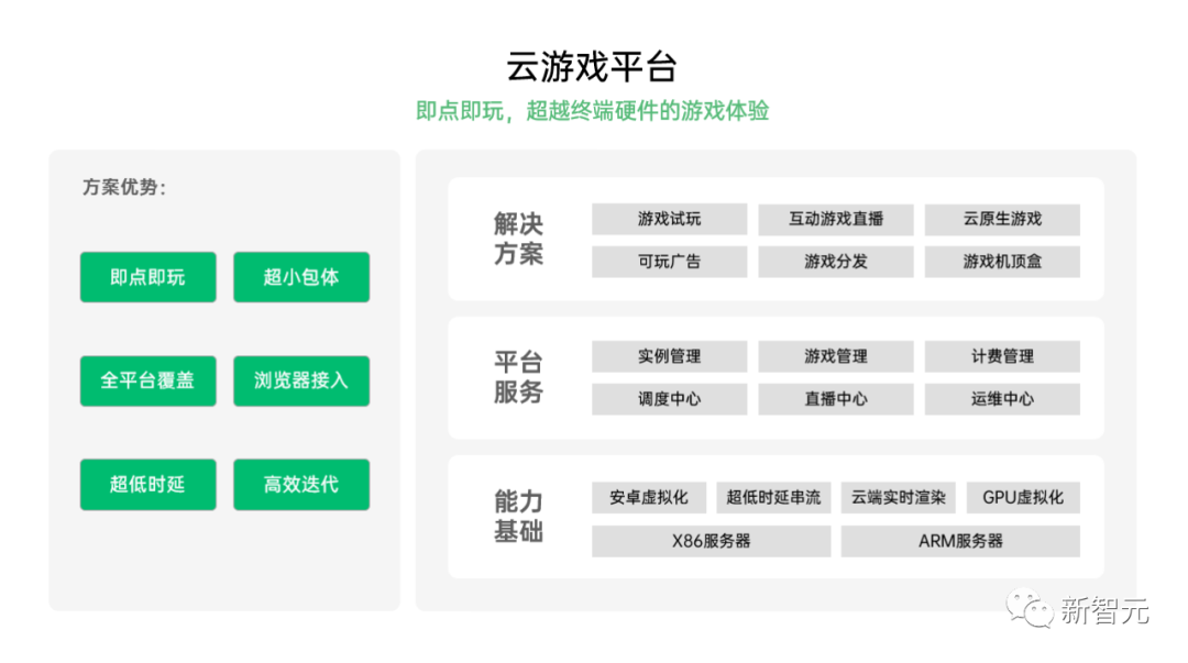 它的云游戏平台依托的是安卓虚拟化、超低时延串流、云端实时渲染、GPU虚拟化等基础能力,可以为开发者提供包括实例管理、游戏管理、计费管理等能力在内的平台服务。