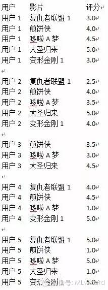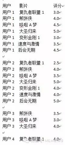 既然是推荐别人看片,肯定是推荐被推荐人没看过的片子。这里我们用用户3为例(因为他看过的片子最少),然后再扩充一下我们的数据集,否则太寒酸了。把原数据集扩充为如下: