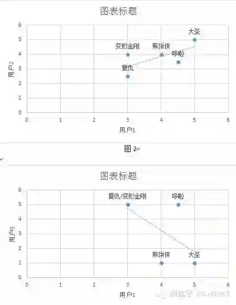 这里有个有趣的情况,图3的两个用户的相似度值为负数,而图中直线的走向是向下的。这个并不是错误,而是另一种情况,叫负相关,通俗的说法就是越接近-1,说明两个用户的兴趣为相反的而不是相似的。图3正好证明用户1和用户5存在一定的相反性。