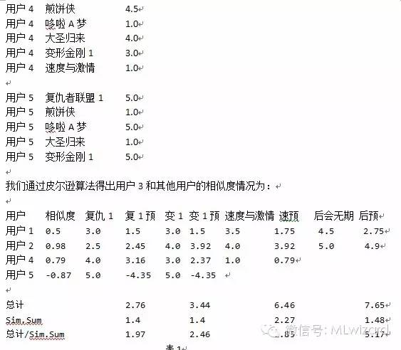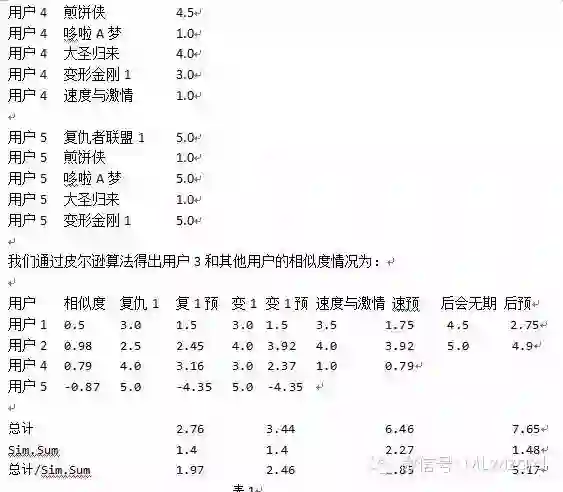 这里来解释一下这张表,我们从表1中看到有很多的“预”这些预有事根据用户相关度,预测被推荐人在看完此片后会打几分。比如复仇1,用户1和被推荐人(用户3)的相关系数为0.5,那么预测用户3在看完复仇1之后可能会给该片打1.5分,以此类推。
