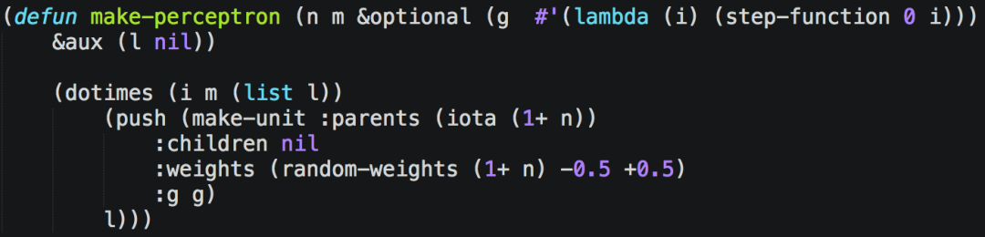 用 Lisp 编码创建有 n 个输入 m 个单元的一层感知机。