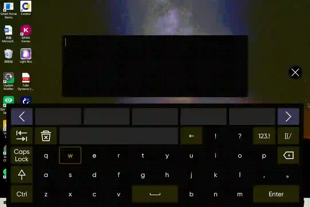 又比方说要在文本框里打字,首先盯着文本框,然后盯一下「键盘」,此时屏幕上就会自动打开眼控键盘。键盘上是所有按键都能用眼控来操作,只需盯一下,就能按下按键。