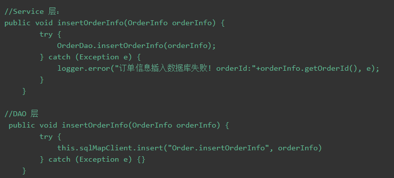 把异常给吃掉了,在 service 层调用的时候,虽然没有打印报错信息,但是这能是容错吗?
