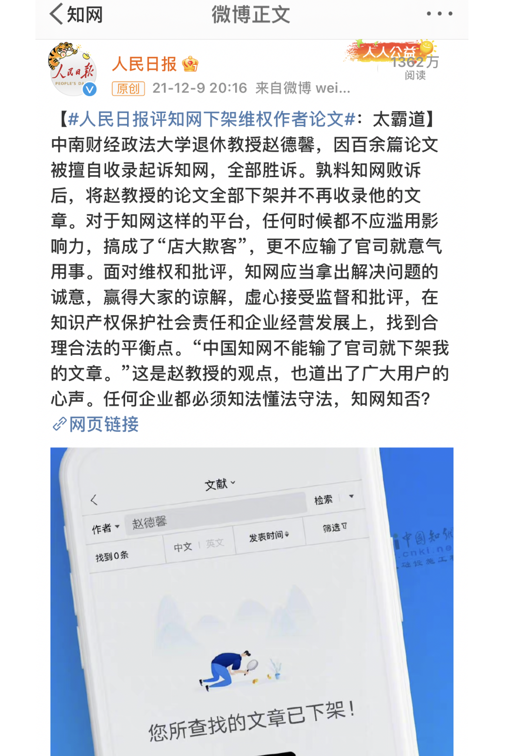 2021年12月,89岁的中南财经政法大学退休教授赵德馨以侵害作品信息网络传播权为由起诉中国知网。原因是知网擅自收录他的100多篇论文,老先生没拿到一分钱稿费,自己下载还要付费。