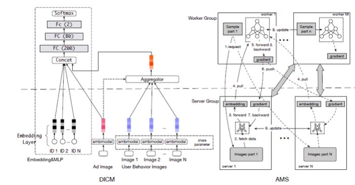 我们实际上采用的一种类似attention的技术达到相关的目的,也是在阿里妈妈的流量效果上使CTR、GMV显著的指标有明显的提升。用户在互联网上浏览各种物料的时候,背后的物料本质的理解非常重要,比如在电商环境下,用户浏览商品的时候,很多时候看到这个商品的图片来决定它到底怎么样进行下一步的行为。我们能不能把这些图片信息能够到深度神经网络来做更好的用户兴趣的建模?这样带来一个挑战,任何一个行为从商品的ID变成一个商品的图片,在样本里面数据量是增大非常多倍,一个ID可能用一个几byte的字节表示,如果变成一个图片,动辄几百K甚至几兆,这个数据量至少是上千倍的增长。互联网大规模的数据需要几十或者几百或者上千台机器并行训练,数据量爆膨几千倍,即使对于阿里巴巴这样的公司,这样的问题也是很难处理的。