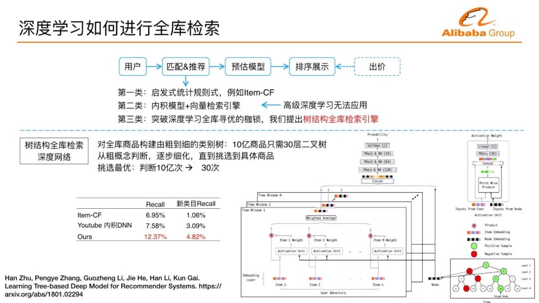 我们针对怎么样用任意的深度学习来做全库的检索寻优,提出树结构的全库检索引擎,它的想法也比较直观,把整个商品建立成一棵层次化的树,有十亿产品,30层的二叉树,它的叶子层可以容纳20亿商品。我们的深度学习层每层扫描,每层找到最优,下层的节点在上一层非最优的孩子里面不继续计算,相当于丢弃,直到最后找到全库最优的,把10亿次的衡量变成30次从上到下的衡量,解决深度学习如何在全库找最优的问题,解决了检索和匹配的问题。这样的方法跟前两代方法比较,推荐召回率有非常明显的提升。