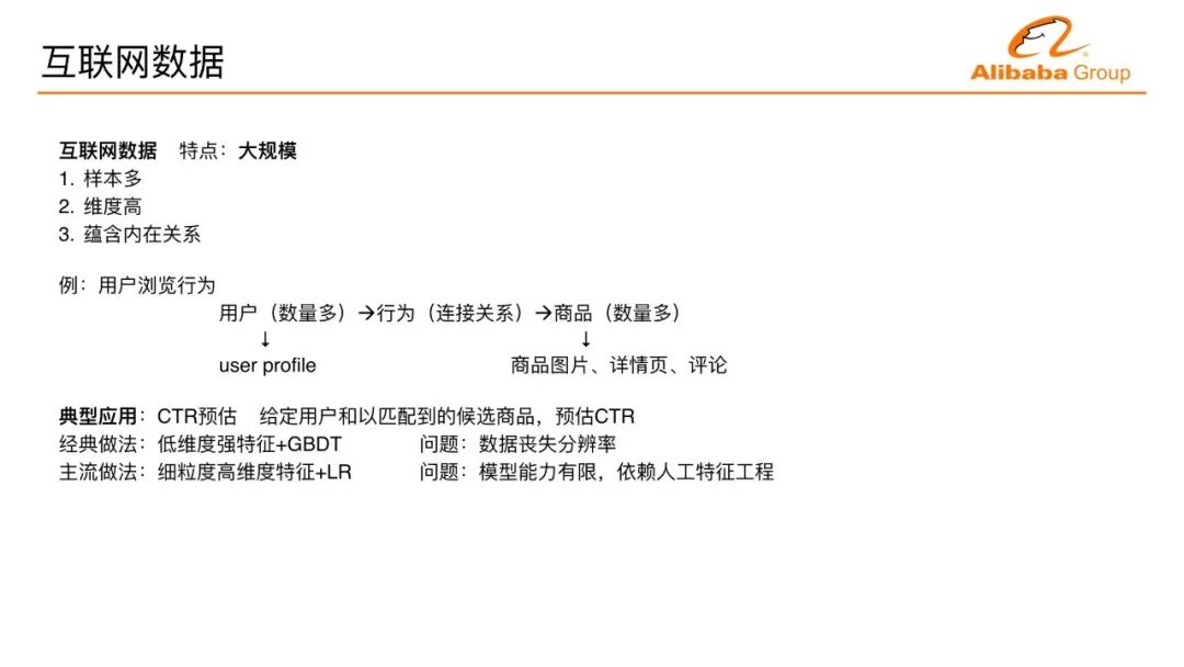 首先,互联网下的大数据。互联网的数据有什么特点?第一个特点是规模大,转化成机器学习的语言就是维度特别高,样本特别多,另外互联网数据内部也有丰富的内在的关系。