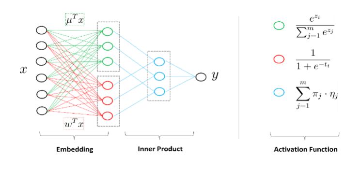 这是模型用神经网络的观点来看的示意图。来了一个样本之后怎么计算?首先计算对每个区域的隶属度,假设有四个区域,会计算一个隶属度。假设正好这个样本属于第一个区,隶属度是1000,对每个区域里面还有一个预测器或者线性分类器,对每个区域里面有一个预测值,这四个预测值组成起来又是一个向量。上面的四维向量和下面的四维向量做内积,第一个区域的预测值选出来,实际为了数学处理方便用一个软的隶属度表述而并不是1000这种硬的方式。