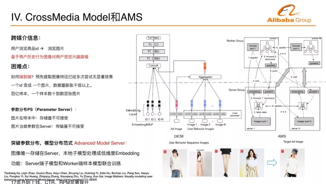 刚才讲过,很重要的一个经验,只有端到端才work。这个图像特征在阿里妈妈内部很多团队尝试,把图像变成feature加入到CTR预估模型里面,如果CTR预估模型很强,这么加没有作用。我们做这么一个端到端的训练,提出新的模型分布的服务器,把参数分布方式变成模型分布方式,Server端不只有参数而且有子模型在计算,并且会和worker端主模型一起更新。这使得图像可以处理成一个向量再传输,几十倍、几百倍,整个传输量降下来,使得整个联合训练的过程变成可能。通过框架上的分布式的变化来完成这个挑战,在阿里妈妈的内部业务线上线,点击率或者商业平台的收益能力上有一个很显著的提升。