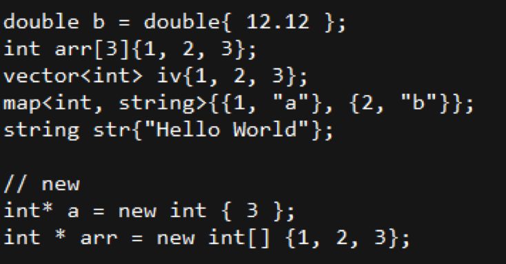 C++11前只有数组能使用初始化列表。而C++11后大部分类型都可以初始化列表,方便的很。如下所示。