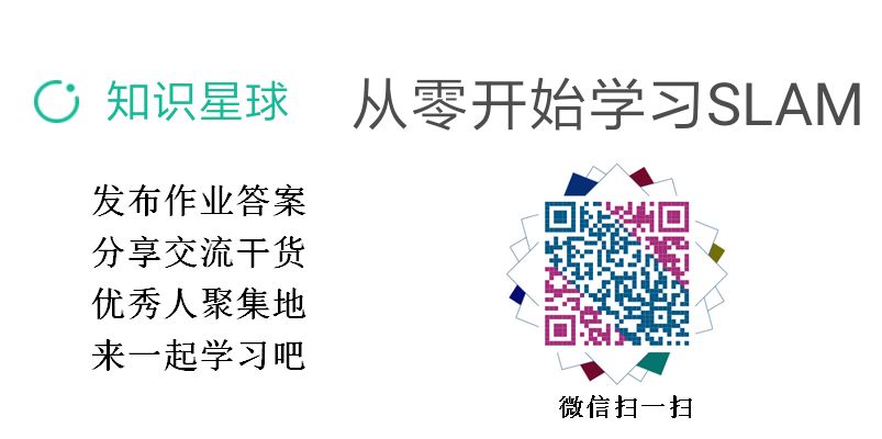 欢迎留言讨论,更多学习视频、文档资料、参考答案等扫描下方二维码进入知识星球「从零开始学习SLAM」和其他学习SLAM学的伙伴一起学习交流~