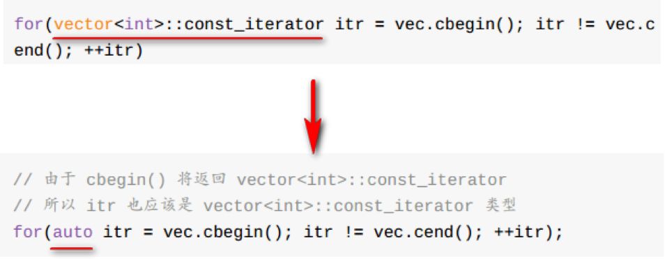 举个栗子。C++11之前如果我们要定义并初始化一个新变量,必须得知道其类型并定义,这在很多时候是非常繁琐的,比如迭代器的使用,而C++11之后引入了自动类型推导,一个auto解决一切,不需要关心类型,编译器会帮你自动推导出类型。