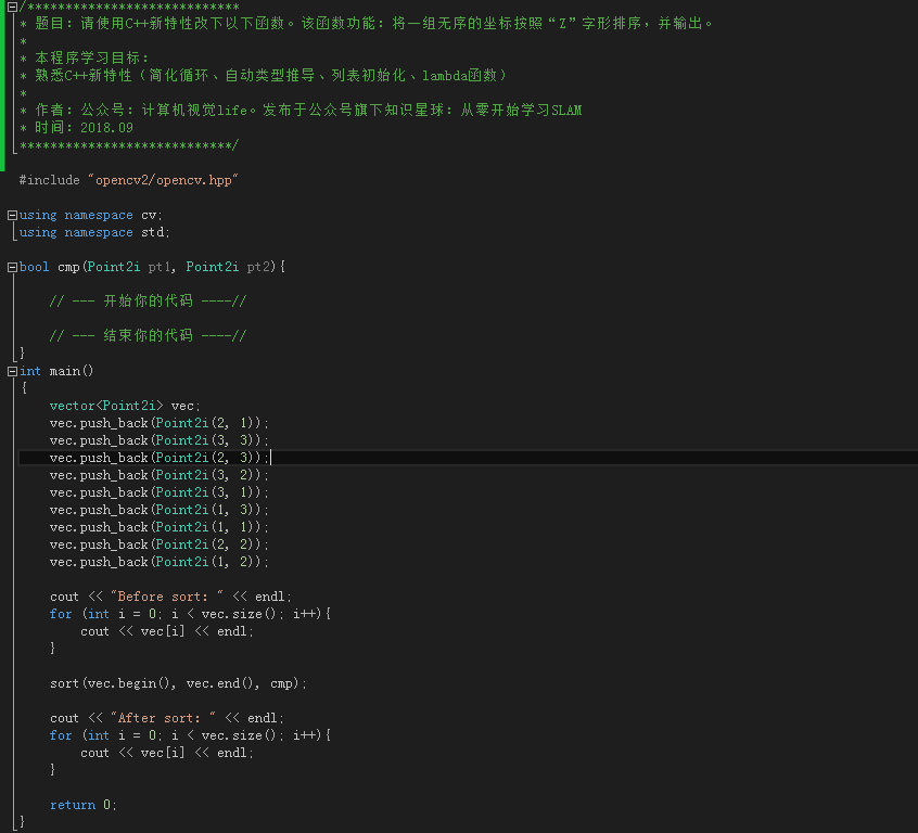 请使用C++新特性改写以下函数。该函数功能:将一组无序的坐标按照“Z”字形排序,并输出。