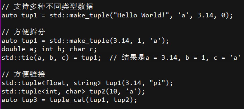在Python和MATLAB中可以非常方便的使用可以变长的参数,C++11以后引入了tuple,可以实现类似功能,并且可以传入多个不同类型的数据,如下图所示