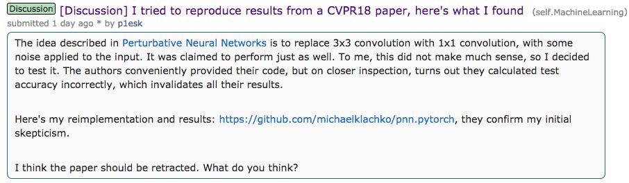 事情是这样的,有人试着去复现了CVPR 2018的一篇论文——CMU和密歇根州立大学的《Perturbative Neural Networks》,发现得不到作者在论文中所描述的结果,他认为这表明论文作者计算有误,因此其结果无效,于是就在Reddit发帖(在他大前天向作者发邮件但没有收到回复后)问众网友: