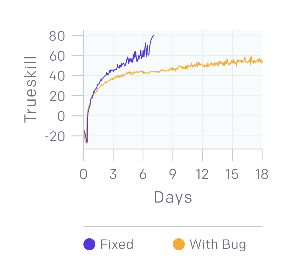 我们仍在修复错误。上图中的黄线模型已经可以击败业余玩家,但修复了一些Bug后,它的提升非常明显。这给我们带来的启示是即便已经击败更强的人类玩家,我们的模型还是可能隐藏着严重错误。