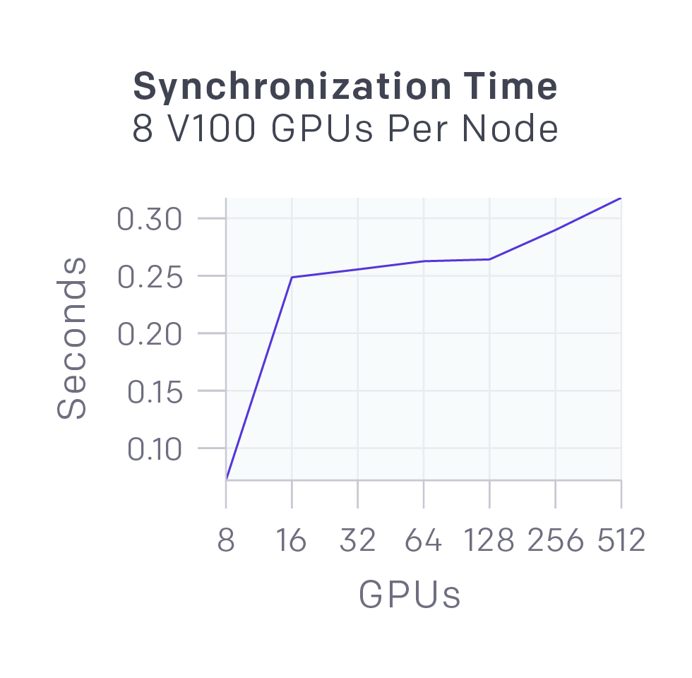 上图显示了不同数量的GPU同步58MB数据(OpenAI Five参数)的延迟,几乎可以被并行运行的GPU计算所掩盖。