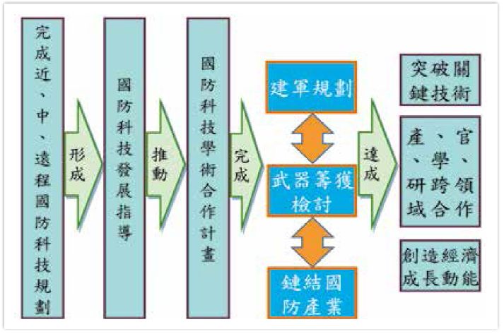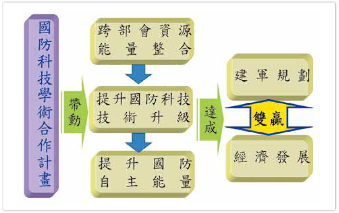 “国防科技学术合作计划”每年挹注预算约1亿余元,导入“国防”科技前瞻规划之重要性,参采专家小组讨论法、科技发展趋势分析等方法,以形成“国防”科技指导,聚焦于“国机国造、国舰国造”等前瞻领域上,引领产业升级,推估中、远程需求,将“部会间层级”提升至“国家间层级”,并考虑环境需求,由技术导向(technology push)转型为需求导向(demand pull),然后进行“国防策略性整合规划” (strategical planning),以遂行“国防”科技发展具备近、中、远程之规划及共识,并纳入“全国科技会议”的议题中讨论,将更能聚焦在科技发展的适切性,藉此建立中、长程科技发展的目标。