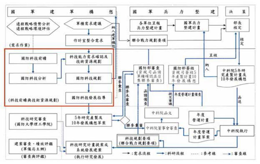 国防前瞻规划机制作业,乃采以国防科技发展趋势为方向、考虑军队远程战略情势、国际环境分析与军队各军种需求为输入,利用作战场景需求进行验证,在完整规划下,提出愿景、拟订10年建军构想、5年兵力整建。上述作为,于运用年度重要演训规划(如计算机辅导兵棋推演等),结合美方观察人员就台湾用兵作战现况从旁了解,以推估实际用兵作战情形,来审认并多方讨论与修正方向,藉由检讨会方式,提出可行性建议,确立10年建军构想、5年兵力整建规划蓝图后,旋由战略规划司启动建案程序,并请资源规划司与军备局移交由中山科学研究院开始投入预测的新武器需求后,进行技术地图展开及建案审查,以完成“国防”科技规划后,逐步进行10年发展构想及5年科技研究应用与产制计划(如图2)。23