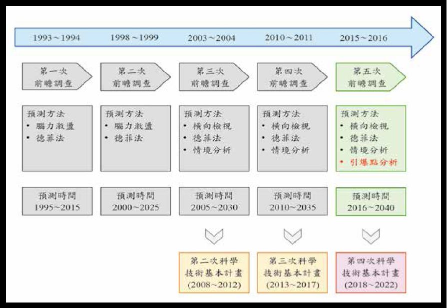 韩国在韩战之后,有鉴于科技研发实力乃代表国家对外竞争力的重要因素,于1993~2016年共进行了5次国家级科技前瞻调查(如图3),目的即为建立「国家重点科学技术战略蓝图」,政府各部会则依据此蓝图来规划年度计划,具体将前瞻调查成果,落实在政策规划与计划执行上。28