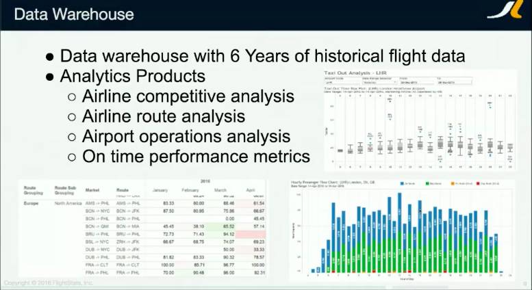 我们将所有的历史数据存储在数据仓库中,所以现在我们有六年历史的航班数据。这使我们的分析产品成为可能,所以我们允许航空公司进行竞争分析和路线分析。