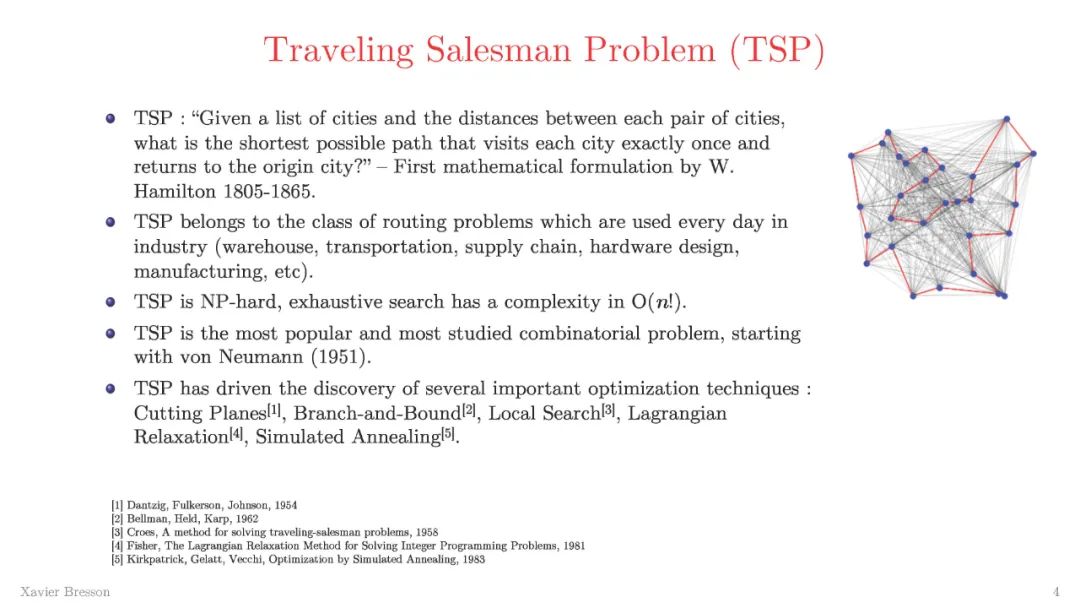 旅行商问题(TSP)是最受欢迎和研究最多的组合问题,始于1951年的冯·诺依曼。它推动了几种优化技术的发现,如切割平面、分支定界、局部搜索、拉格朗日松弛和模拟退火。