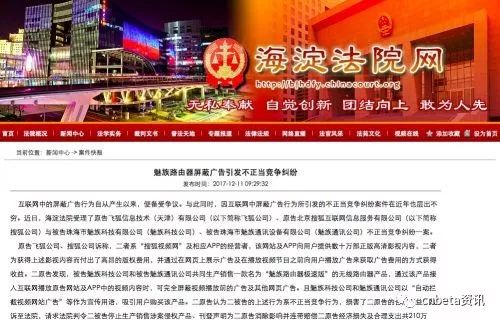 12月11日消息,根据海淀法院官网消息,因认为魅族路由器屏蔽广告构成不正当竞争,飞狐信息技术(天津)有限公司(以下简称飞狐公司)、北京搜狐互联网信息服务有限公司(以下简称搜狐公司)将珠海市魅族科技有限公司(魅族科技公司)、珠海市魅族通讯设备有限公司(魅族通讯公司)告上了法庭。近日,海淀法院受理了此案。