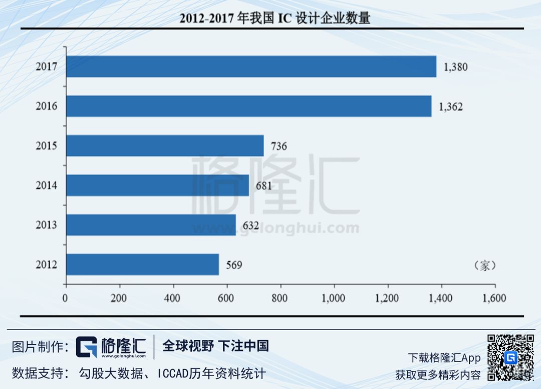 我国 IC 设计企业的数量自 2012 年以来逐年增加,并逐步进入到全球市场的主流竞争格局中,截至 2017年底,我国 IC 设计企业达到1,380家。根据 IC Insights的数据,2017 年我国集成电路设计企业在当年全球前五十大 Fabless 企业中占据了 10 个席位,已逐步进入全球市场的主流竞争格局中。