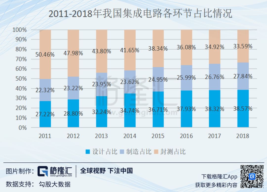 集成电路设计业占我国集成电路产业总产值的比例已经达到38%,制造占比27%,封测占比33%。