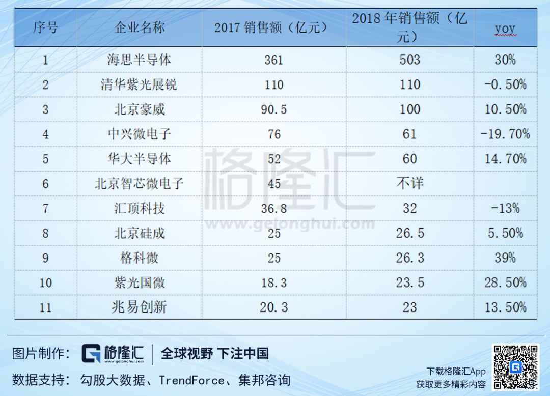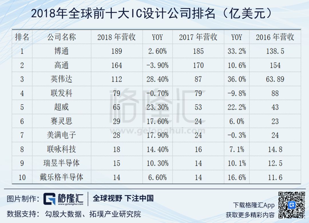 根据集邦咨询统计,2018年中国IC设计企业营收规模超10亿美元的企业有3家;排名前十的企业中,有3家企业表现突出,全年营收成长率超过20%,而2家企业则出现超2位数的下滑。