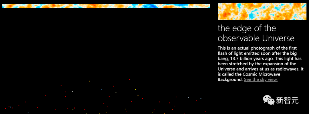 地图的顶部,是137亿年前大爆炸后不久发出的第一次辐射闪光,被称为「宇宙微波背景」。