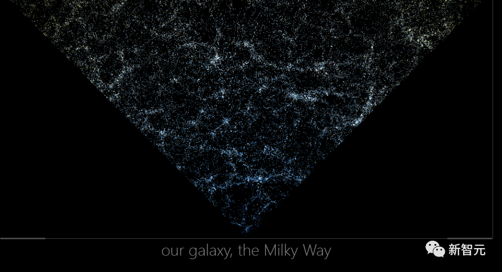在地图上,每个点都是一个星系,每个星系包含数十亿颗恒星和行星。而我们所在的银河系只是这些点之一,位于地图的最底部。