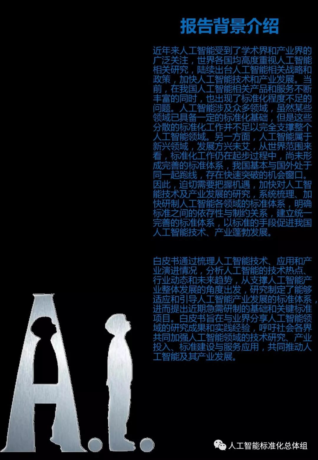 为贯彻落实党的十九大关于推动人工智能和实体经济深度融合工作要求,落实《新一代人工智能发展规划》对标准化工作的部署,充分发挥标准化工作对人工智能技术、产业的支撑推进作用,中国电子技术标准化研究院组织编写了《人工智能标准化白皮书》。