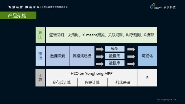 计算层:基于永洪的MPP数据集市及R,通过列式存储、分布式计算、内存计算等方式保障计算性能;