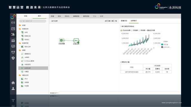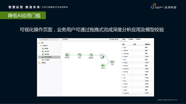 第三步:通过可视化拖拽的方式,选择合适的算法与模型,完成深度分析应用,比如将数据集自动拆分成测试集和训练集,选择特征值、构建算法模型、对模型评分等;