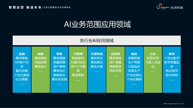 永洪的AI产品应用领域,目前已经覆盖了金融、保险、零售、互联网、交通物流、运营商、制造、公安、教育等行业。
