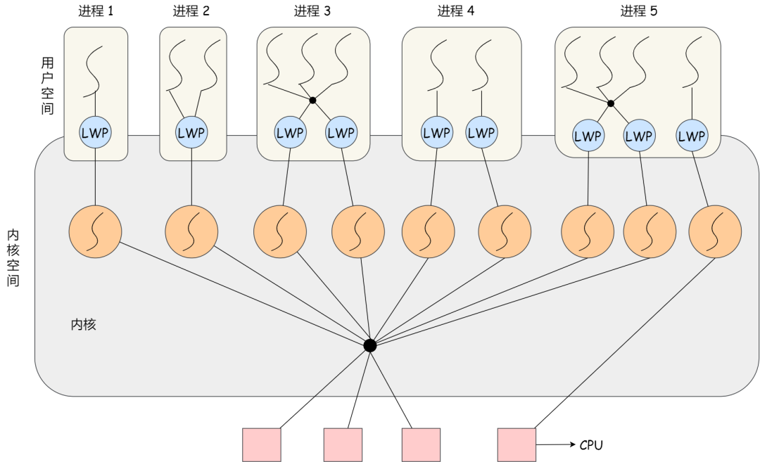 根据前面的两个模型混搭一起,就形成 M:N 模型,该模型提供了两级控制,首先多个用户线程对应到多个 LWP,LWP 再一一对应到内核线程,如上图的进程 3。