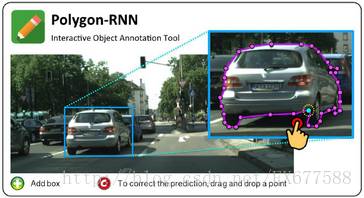 ①、这篇文章算法首先需要给定一个bounding box真值,然后使用一个RNN(Recurrent Neural Network),文中称为Polygon-RNN在这个目标框中画出目标一个多边形圈住的轮廓。因为相比较手动标注目标轮廓,bounding box标注只要两下鼠标点击即可,容易很多(见上方右图)。