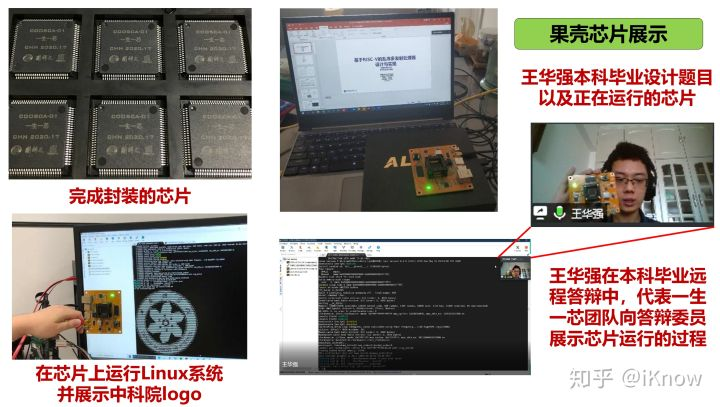 王华强同学代表「一生一芯」团队展示了 COOSCA 芯片的功能。他进一步又将这个核改进为乱序多发射,在 FPGA 上进行了测试验证,结果显示比 COOSCA 核的 IPC 提升了一倍。他的毕业设计也获得了国科大校级优秀毕业设计。