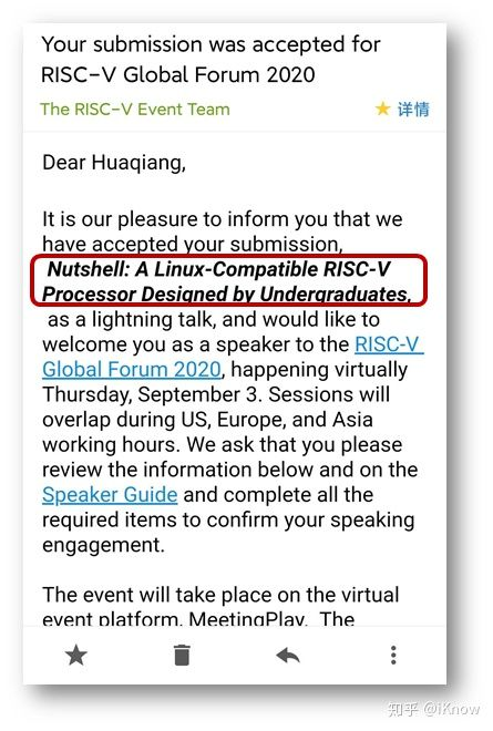 7 月 22 日,王华强又收到了「果壳」被 RISC-V Global Forum 被接收的通知。9 月 3 日,王华强同学将代表团队向全球业界介绍「果壳」的设计,这也是「果壳」首次在国际舞台上亮相。看了一下这次 RISC-V 全球论坛的日程,报告均来自世界各地的业界资深专家,还包括图灵奖得主 David Patterson 教授。国科大本科生能登上 RISC-V 全球论坛介绍他们设计的处理器核,这在国际上也是非常难得了。作为教学团队成员,我们内心也有一份自豪。