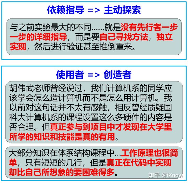 在一款功能完整的芯片,有一些关键模块的原理是课堂上没有详细介绍的,学生要正确地实现这些模块,需要一个探索的过程。这意味着学生不能像课程作业那样按部就班地完成,而是会经历设计方案的调整,甚至是整个方案的推倒重来。这容易导致学生感到焦虑或沮丧,因此教师需要对学生的心态进行正确的引导,告诉他们不确定性是探索过程中的客观规律,然后引导学生去总结探索失败的经验,去深刻地分析当前方案不可行的原因,从而加深对问题的理解,让学生正确认识到探索失败的意义。