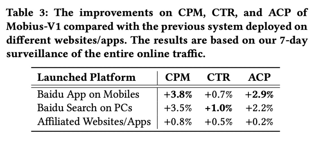 目前“莫比乌斯”已经部署到PC端百度搜索以及移动端百度APP上,从线上一周的监控指标来看,CPM涨幅还是非常大的,可以说效果还是比较明显的。