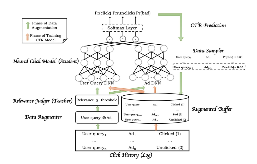 整个系统其实分为两个核心的模块:数据增强模块、模型训练模块。论文中对整个系统的介绍还是比较清晰的,数据增强模块主要是用户生成模型所需的训练样本,生成的训练样本需要能够针对“低相关性高点击率”的badcase有所区分;模型训练模块主要就是介绍模型是如何利用生成的样本数据进行迭代更新的。